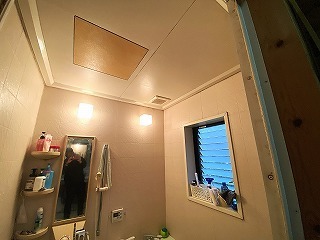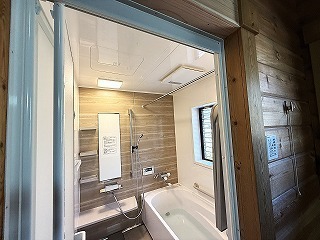 浴室暖房換気乾燥機が付いたシステムバスになった、リフォーム後の浴室。浴槽の所に付いている水栓が太陽熱温水器からの給湯です。