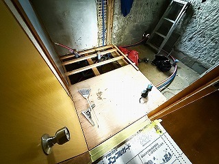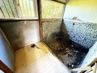 浴室の内部を全面解体したところ。この後洗面所の床組みも解体します。