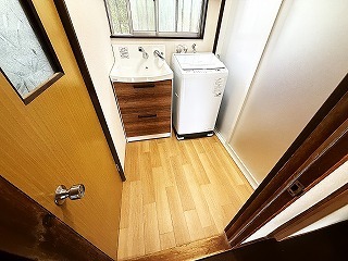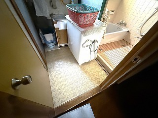 リフォーム前の洗面・洗濯・脱衣所と右が浴室。狭いため洗濯機がこのような位置にあります。