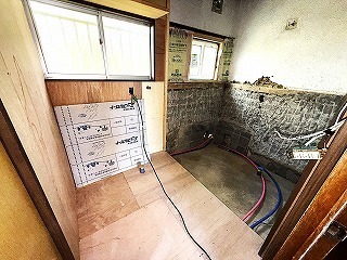 下地組と配管・配線の先行が終わったリフォーム中の洗面・洗濯・脱衣所と浴室。