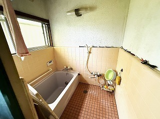 リフォーム前のタイル貼りのお風呂。奥行きを狭くします。窓は断熱サッシに取り替えます。
