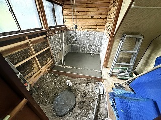解体して洗面所側に1.5尺広くして、土間コンクリートを打ったリフォーム中の浴室と洗面所。