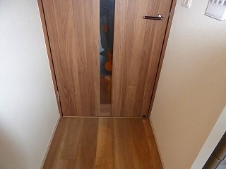 離れの出っ張った洗面・洗濯場を中から見たところ。右側が玄関です。ドア枠の下が傷んでいます。