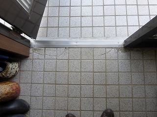玄関ドアの取り替えリフォーム中。枠だけ残して、他はきれいに取り除きます。