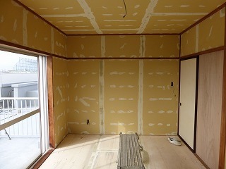 耐水合板を下張りして、隣の部屋と同じフローリングを張りました。この時に間仕切り4本引き込み戸用の敷居を埋め込んで、床面をバリアフリーにしました。