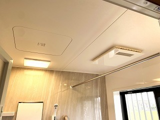浴室暖房換気乾燥機が付いたシステムバスになった、リフォーム後の浴室。浴槽の所に付いている水栓が太陽熱温水器からの給湯です。