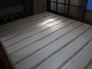 合板を撤去して床組を出します。根太もしっかりしていたので再利用することにし、シロアリ消毒をしました。